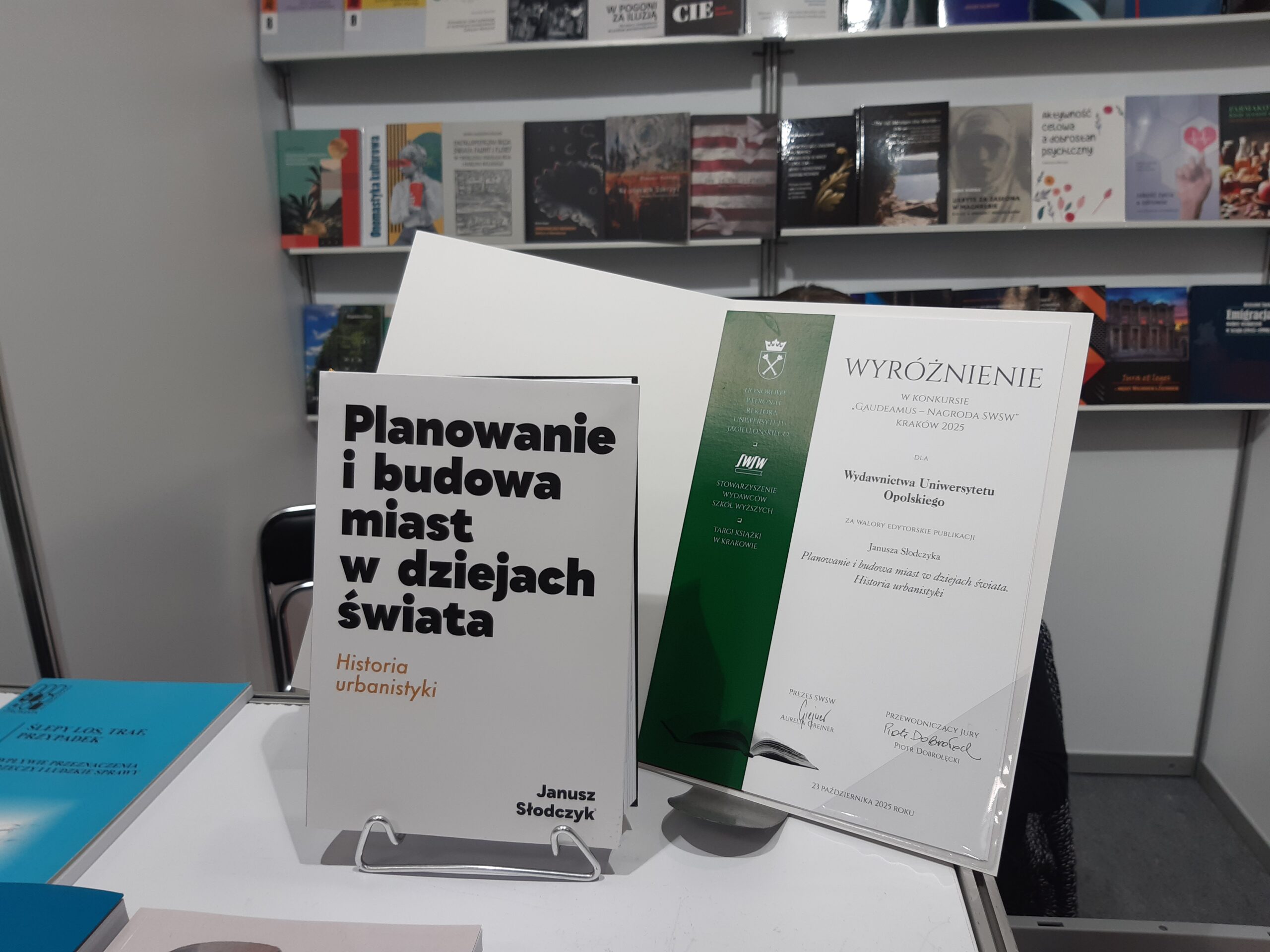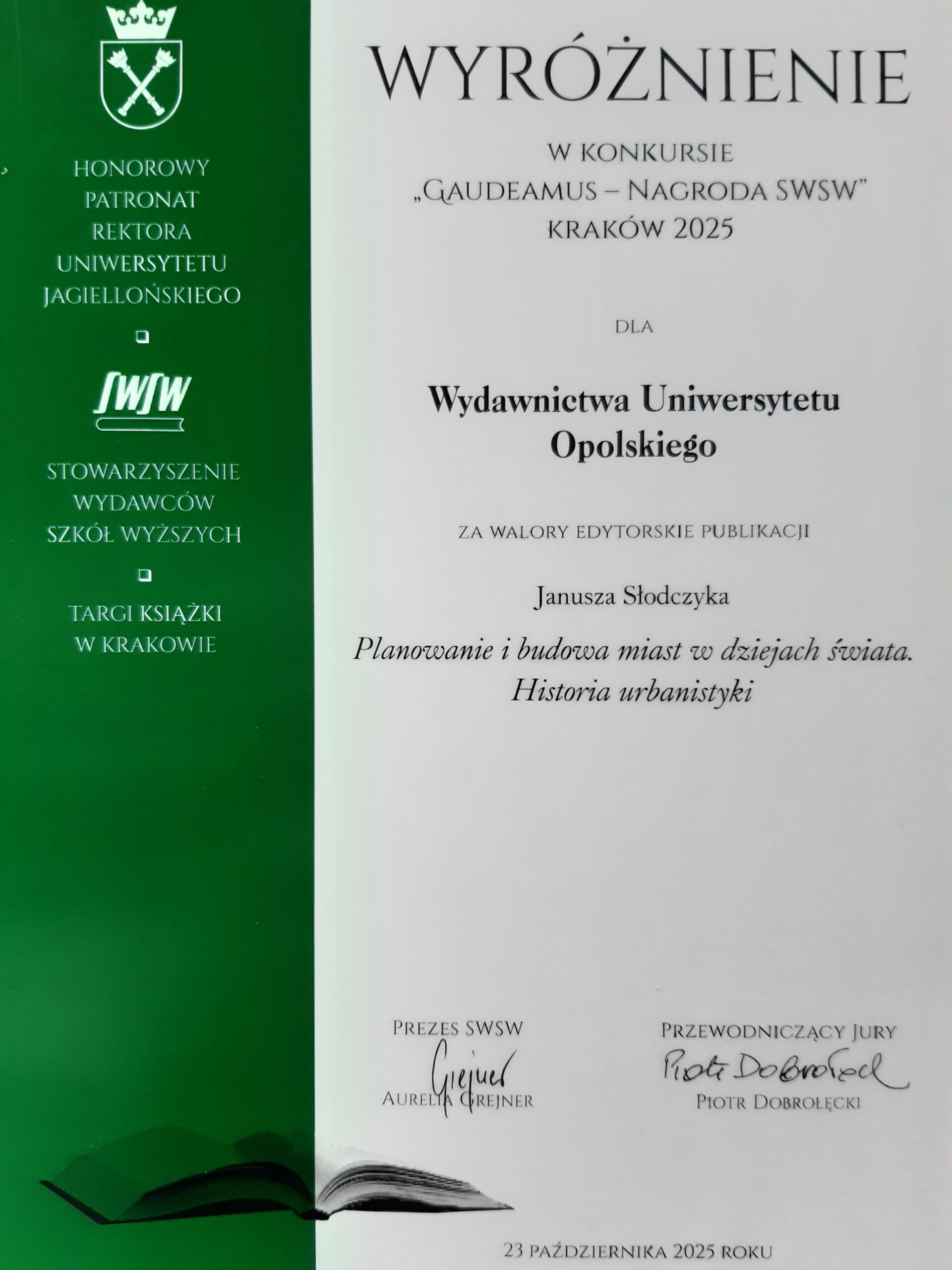 Z ogromną radością informujemy, że Wydawnictwo Uniwersytetu Opolskiego otrzymało wyróżnienie w prestiżowym konkursie GAUDEAMUS 2025 Stowarzyszenia Wydawców Szkół Wyższych za walory edytorskie publikacji: Janusz Słodczyk „Planowanie i budowa miast w dziejach świata. Historia urbanistyki”, ISBN 978-83-8332-073-1, Opole: Wyd. UO, 2024, format B5, 832 s., oprawa zintegrowana.